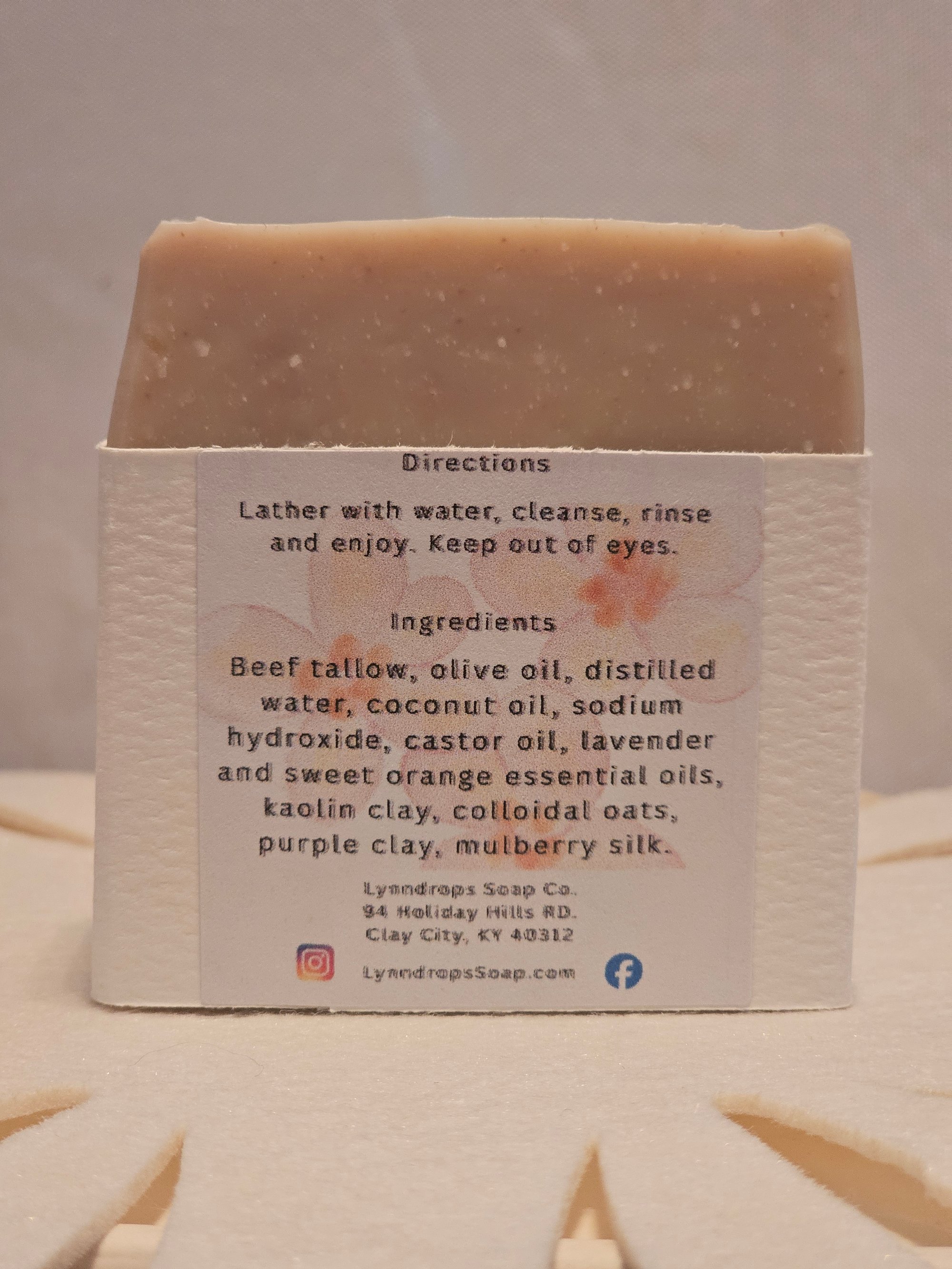 A gentle blend of soothing lavender and bright sweet orange creates a light, calming aroma with a soft citrus lift. This handcrafted soap is made with nourishing beef tallow, olive oil, coconut oil, and castor oil to produce a creamy, conditioning lather. Subtle swirls of Brazilian purple clay give each bar a naturally beautiful, one-of-a-kind finish.