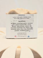 Lullaby Lavender is a soft, calming soap bar created with a gentle blend of oils and butters for a creamy, nourishing wash. It's enriched with French blue clay, kaolin clay, colloidal oats, calamine powder, and mulberry silk, giving the bar a smooth, velvety lather and a beautifully silky feel. Lightly scented with a touch a lavender for a soft, peaceful aroma, this bar is crafted with a higher super fat for an extra gentle, comforting cleanse.